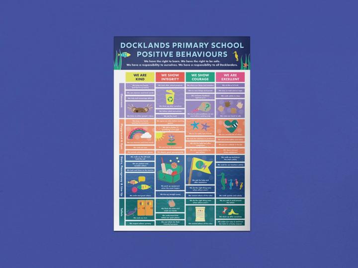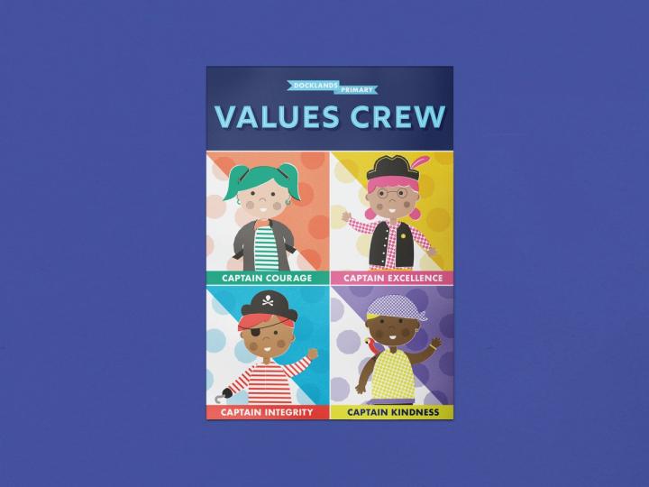 We created the Docklands Values Crew to integrate the school’s values through their communications. The illustrations are bright, playful and inclusive. They have been used on posters, certificates and to add character to the school’s website.