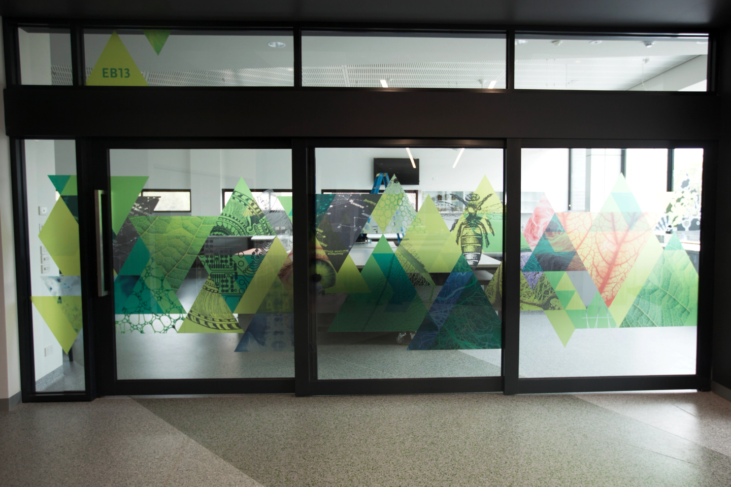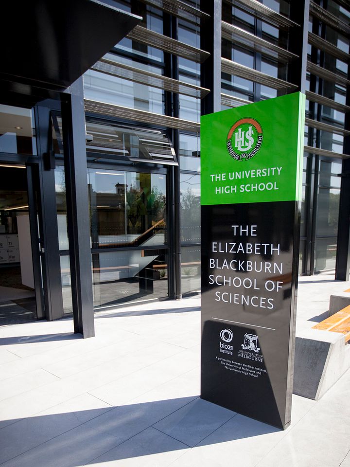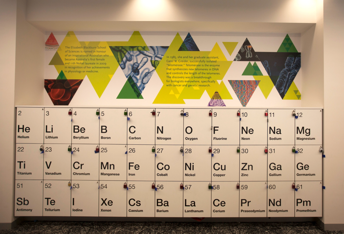 We designed a comprehensive wayfinding and environmental graphics system for the Elizabeth Blackburn School of Sciences. Scientific imagery anchors the visual identity, while integrated directional signage supports intuitive movement through the space.