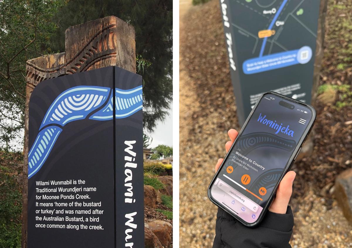 A Wurundjeri-led experiential trail along a re-naturalised section of Moonee Ponds Creek showcasing the cultural and ecological significance of the waterway. With interpretive planning by Kelp Creative, the trail honours Moonee Ponds Creek as a place deeply connected to Wurundjeri people – lived in, cared for, and celebrated across generations.